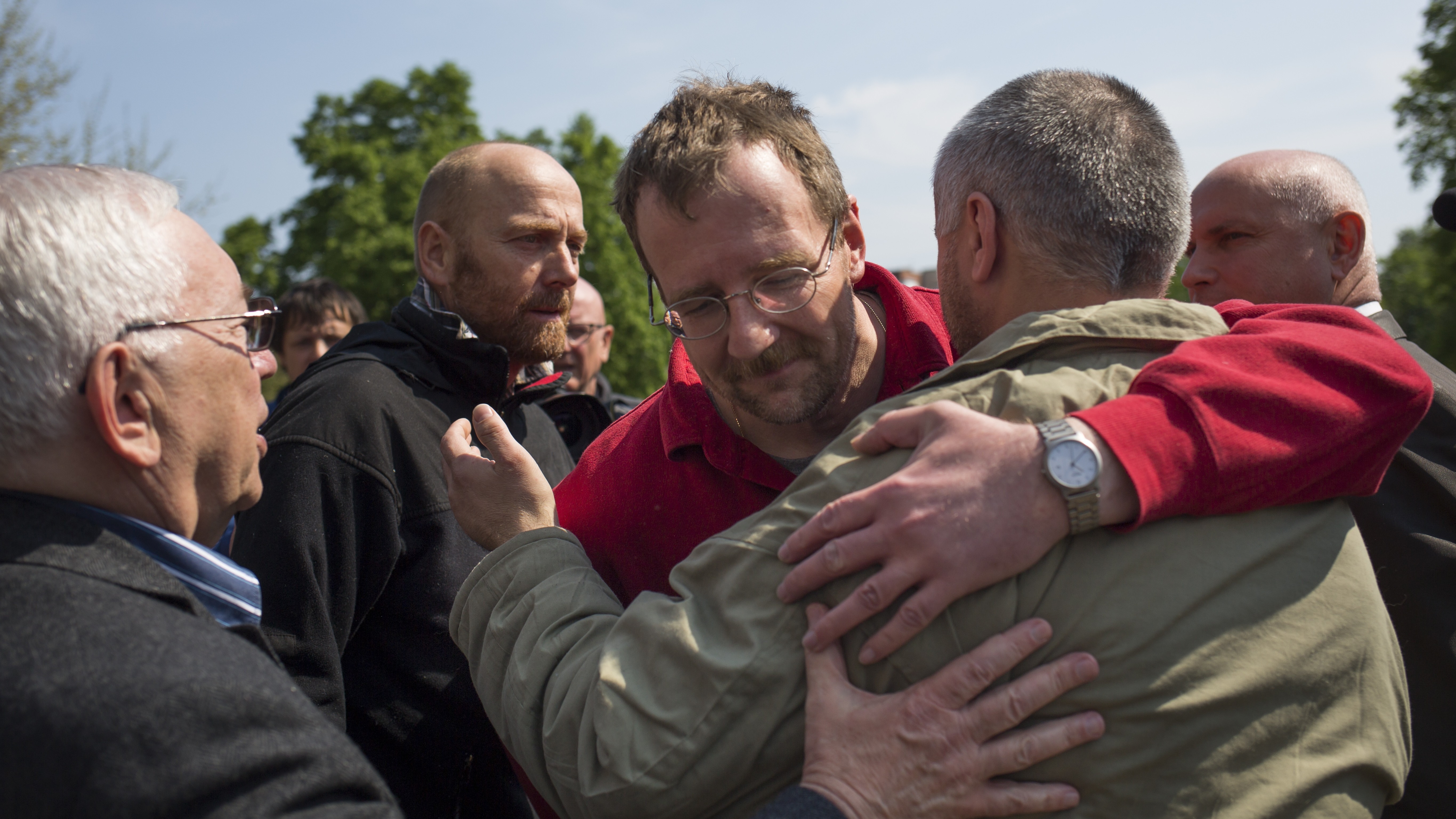 Military observers including German Col. Axel Schneider, second left, hug each other after being released in Slovyansk, eastern Ukraine, Saturday. They were released to Russian envoy Vladimir Lukin, left. (AP)
