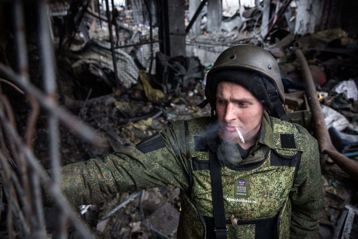A pro-Russian rebel walks amongst the wreckage of the destroyed Donetsk airport on February 26, 2015 in Donetsk, Ukraine. The Donetsk airport has been one of the most heavily fought over pieces of land between the Ukrainian army and pro-Russian rebels. (Photo by Andrew Burton/Getty Images)
