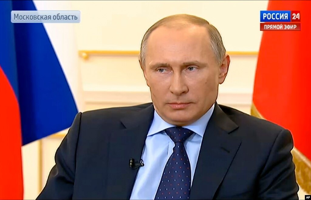 In this frame grab provided by the Russian Television via the APTN, President Vladimir Putin, during a live feed, answers journalists’ questions on the current situation around Ukraine, March 4, 2014.
