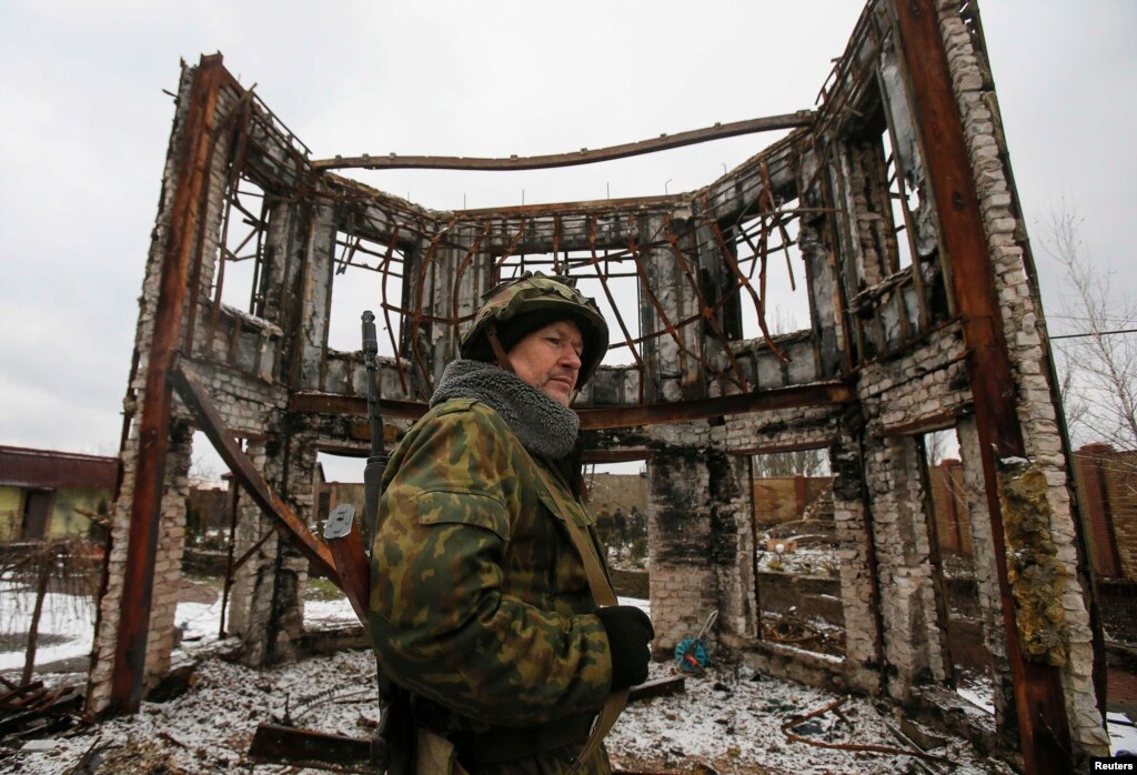 A rebel from the self-proclaimed Donetsk People’s Republic looks on near a building destroyed during battles with Ukrainian forces in Vuhlehirsk in the eastern Donetsk region on February 4.