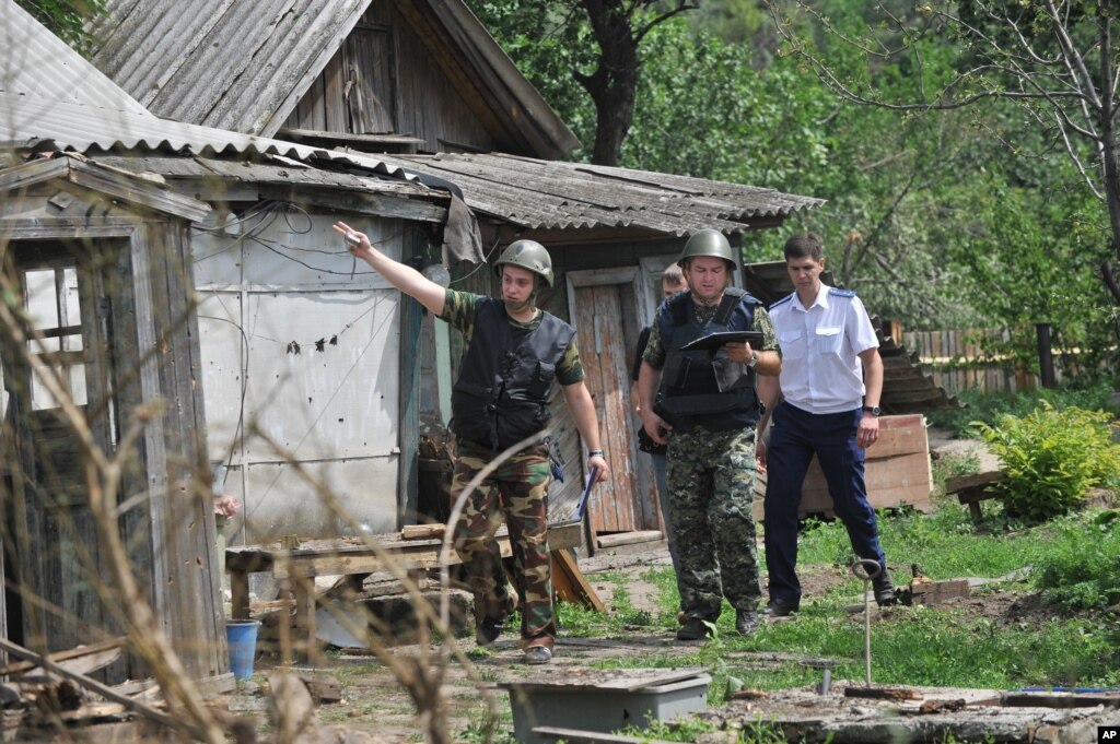 Members of a Russian investigative committee examine a house after shelling in Donetsk, Russia, July 13, 2014.